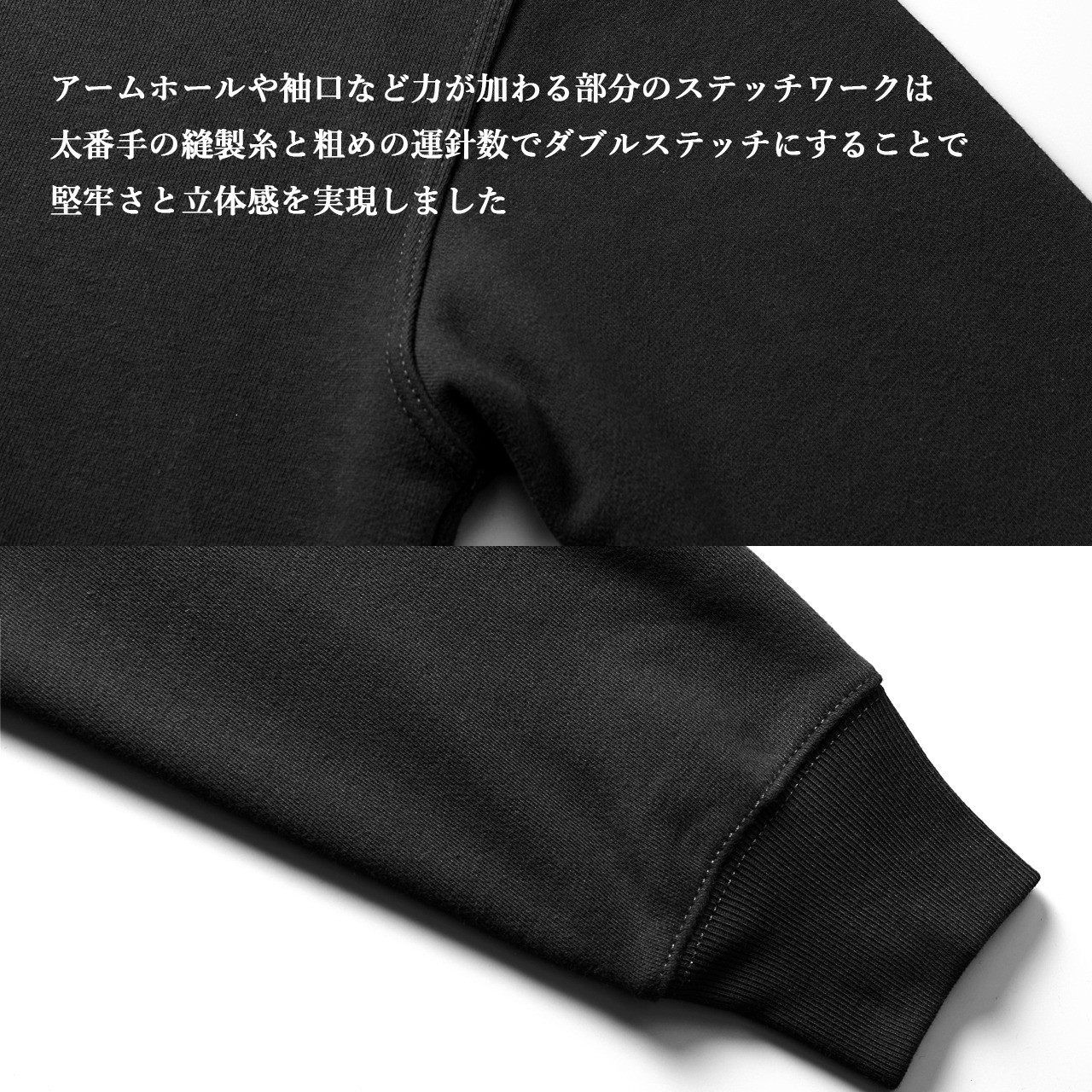 アームホールや袖口など、力が加わる部分のステッチワークは太番手の縫製糸と粗めの運針数でダブルステッチにすることで、堅牢さと立体感を実現しました。